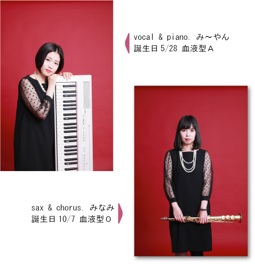 大阪芸術大学出身、vo.&pianoのみ〜やんと、フランスの国立音楽院出身、一児の母でもあるsax.&chorusのみなみから成る女性2人組ユニット。